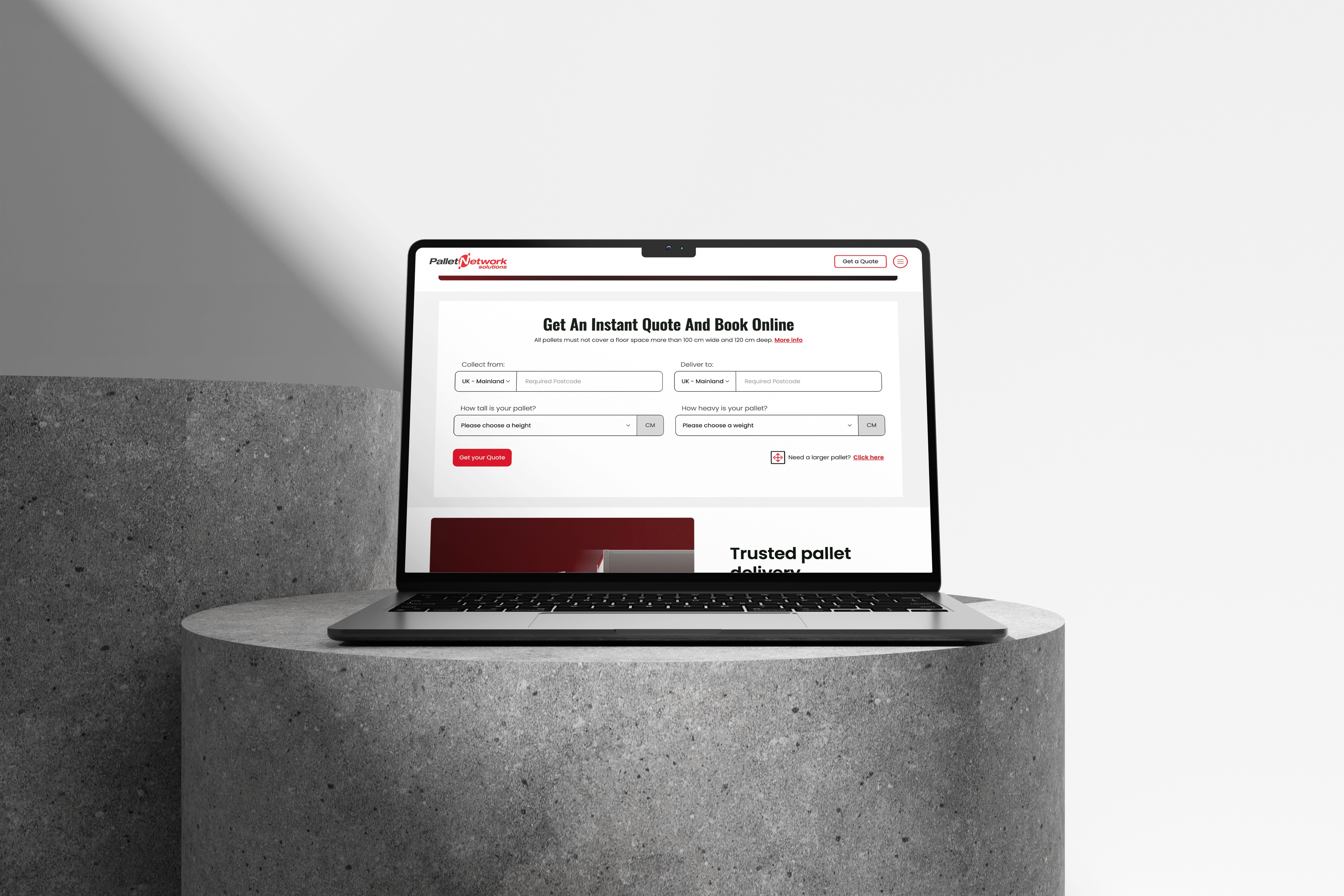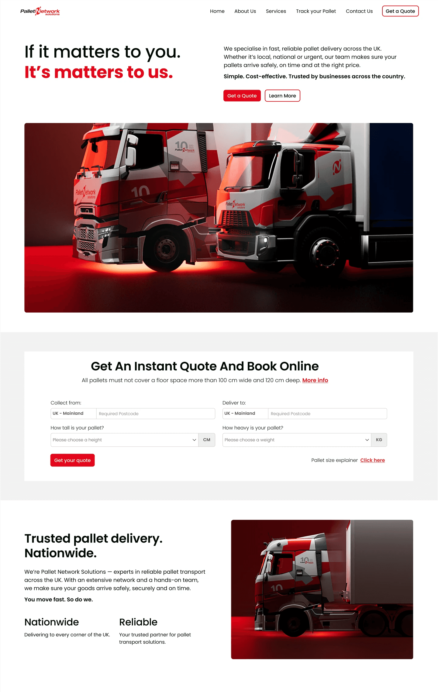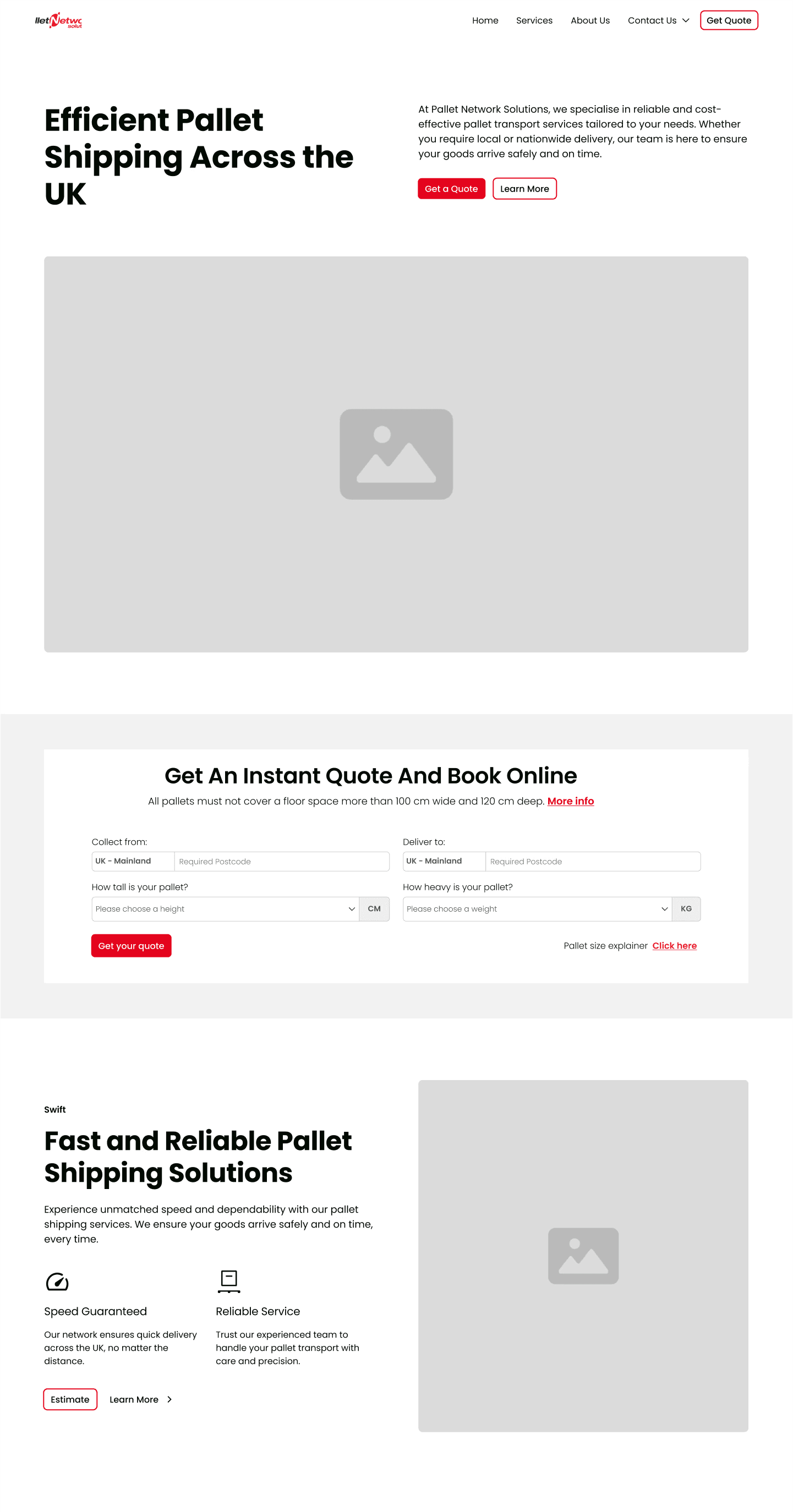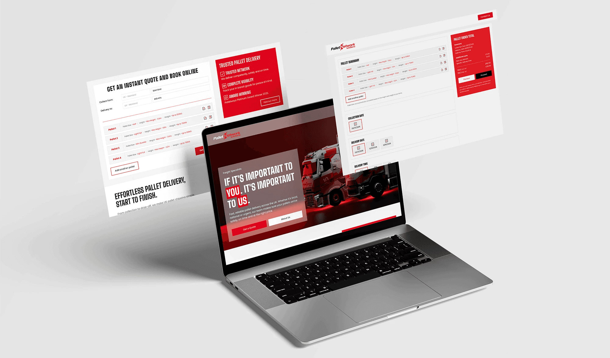 Pallet Network Solutions approached me to design a freight cost estimator tool that allows customers to receive an instant transport quote online. The tool calculates costs based on postcode, weight, and urgency inputs, with the potential for Stripe integration to activate a job immediately after quoting.